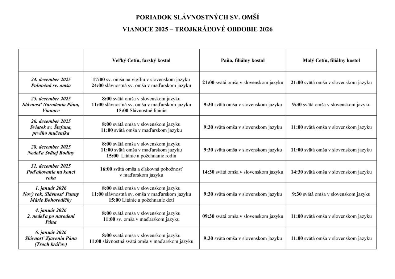 PORIADOK SLÁVNOSTNÝCH SV. OMŠÍ VIANOCE 2025 – TROJKRÁĽOVÉ OBDOBIE 2026