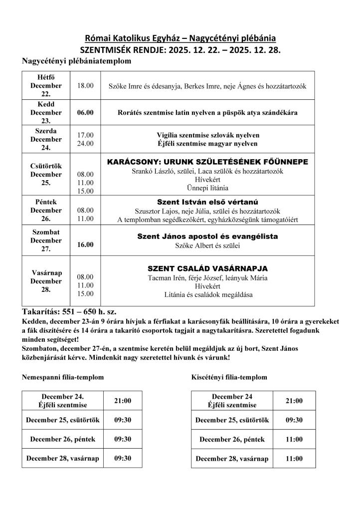 Poriadok svätých omší: 12.12.2025 - 28. 12. 2025