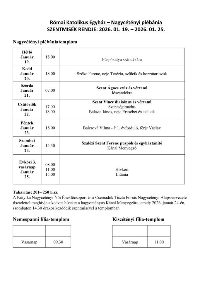 Poriadok svätých omší: 19.1.2026 - 25. 1. 2026