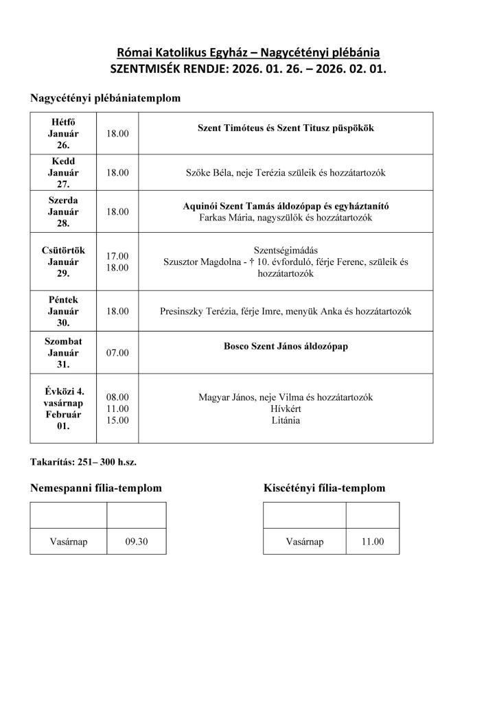 Poriadok svätých omší: 26.1.2026 - 1. 2. 2026