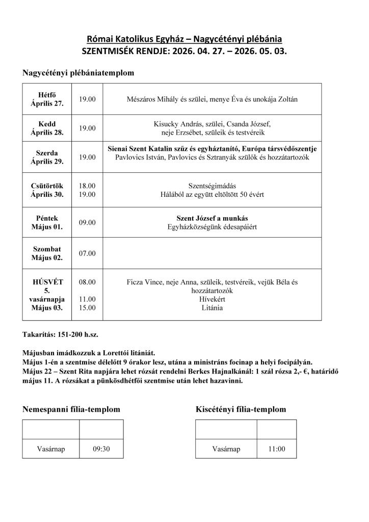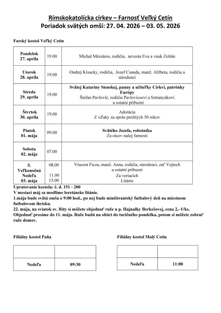 Poriadok svätých omší: 27. 4. 2026 - 3. 5. 2026
