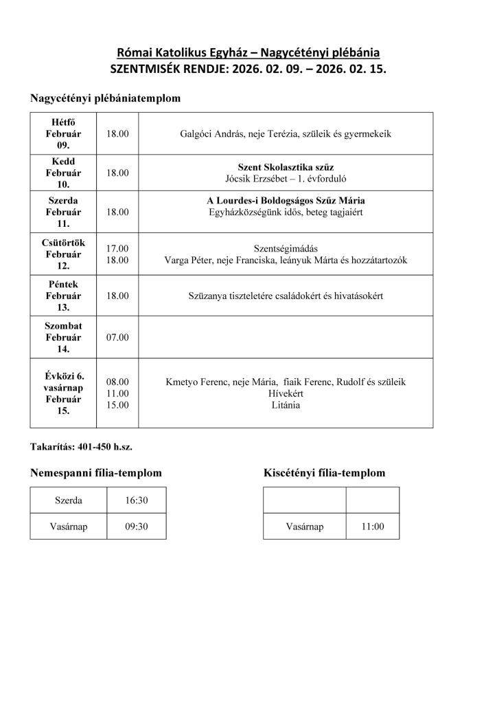 Poriadok svätých omší: 9.2.2026 - 15. 2. 2026