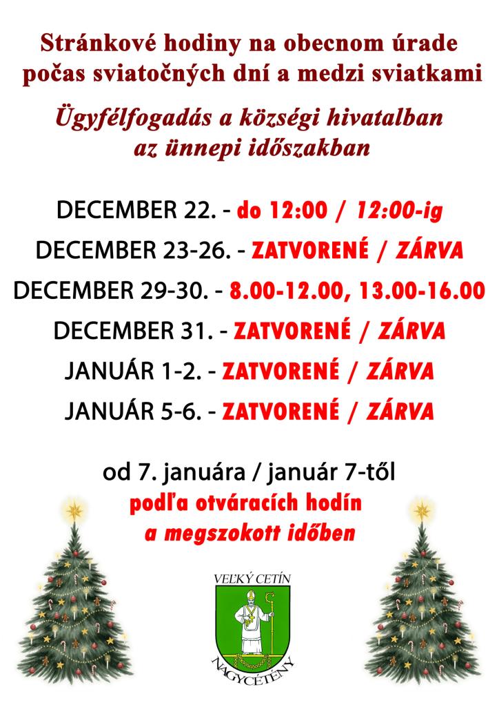 Stránkové hodiny na obecnom úrade počas sviatočných dní a medzi sviatkami